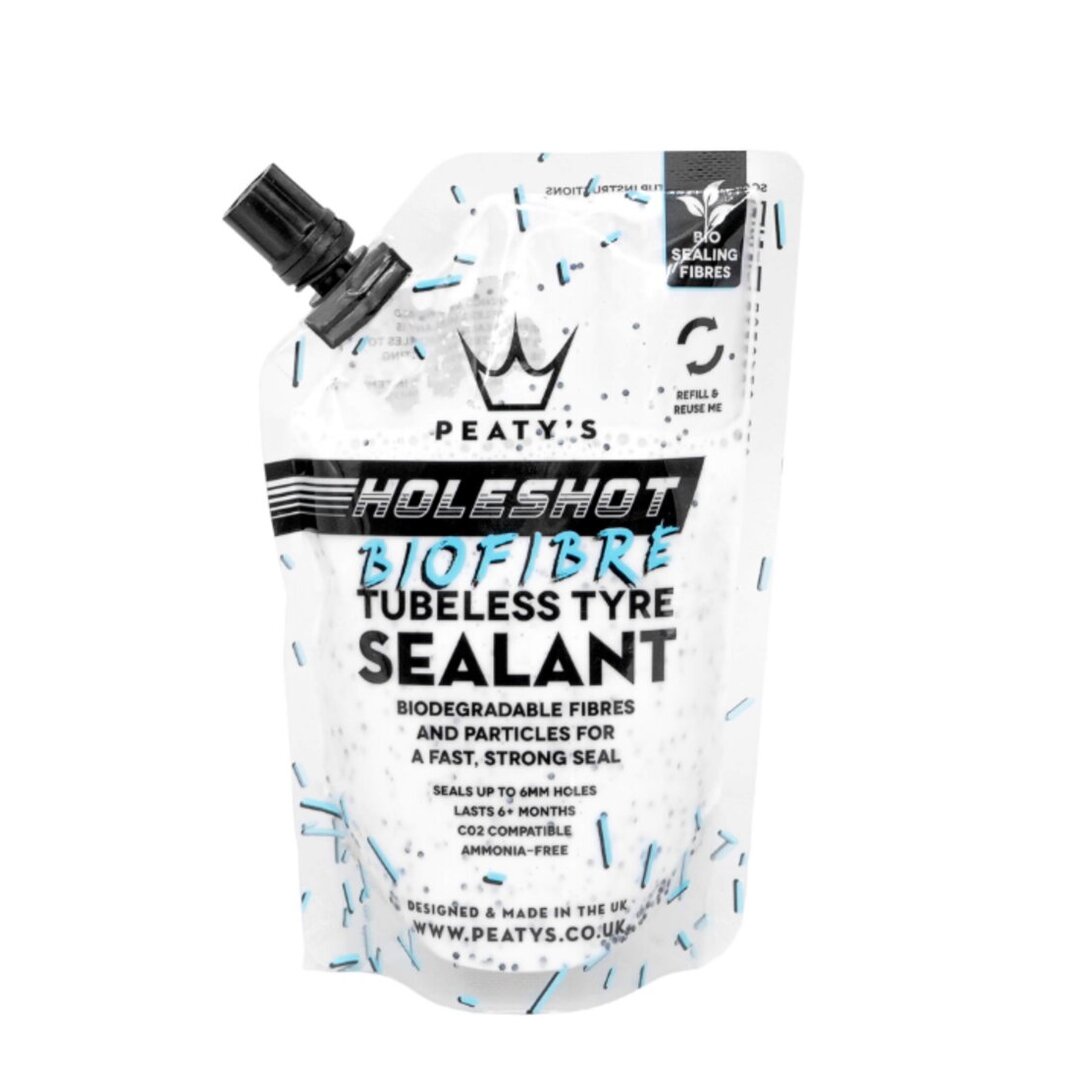 Developed alongside World Cup mechanics and world champion racers. Peaty’s Holeshot Tubeless Sealant is packed full of biodegradable fibres & sealing particles to give a fast and strong seal. Using the latest fast-acting latex, our water-based sealant is ammonia-free, non-hazardous and lasts up to 6 months in the tyre in temperate climates*. It won’t ball up in the tyre and is easily washed out. Our biodegradable fibres and particles bind together with the fast-acting latex to create a clot (like platelets in your blood) to quickly & effectively seal holes and tears up to 6mm.