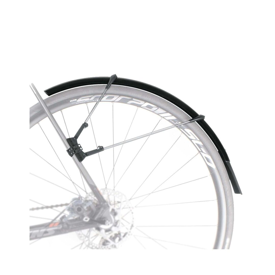 The ultimate clip-on mudguard set for road bikes. Raceblade set for max. tyre width up to 25mm, Raceblade XL (Please see seperately) up to 32mm. The smart, double hinged quick release fitting system also fits aero forks and is compatible with disc brakes. Mudguards can be perfectly adapted to the radius of the wheel by adjusting the length of the stays. Superlight extra long mud flaps give additional spray protection. Includes adhesive protection kit to avoid damaging the paintwork.