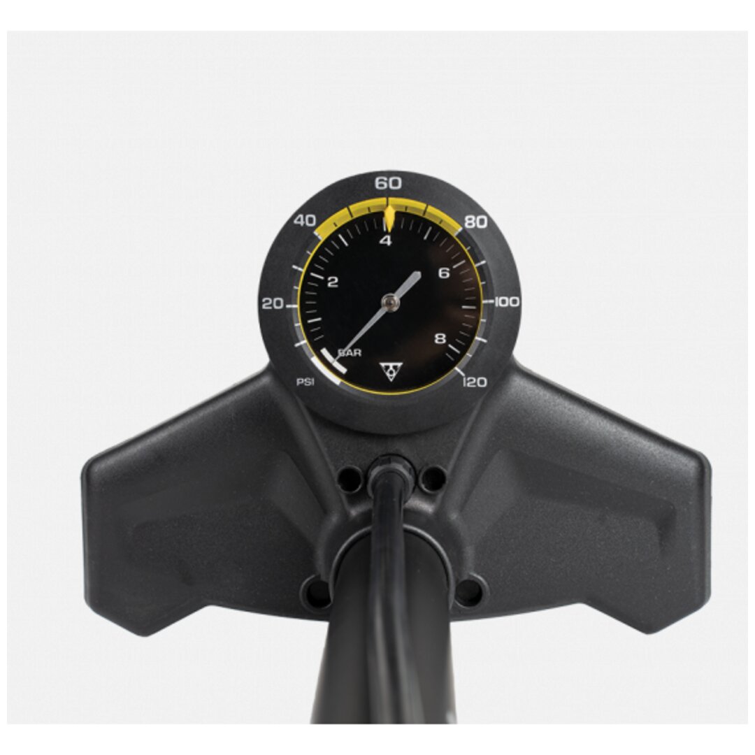 A floor pump specifically designed for road bike and other high pressure tires featuring a large 3.5″ easy-to-read base-mounted analogue gauge for measuring tire pressure quickly and accurately. An optimally sized steel barrel provides high pressure, up to 160 psi / 11 bar effortlessly.
